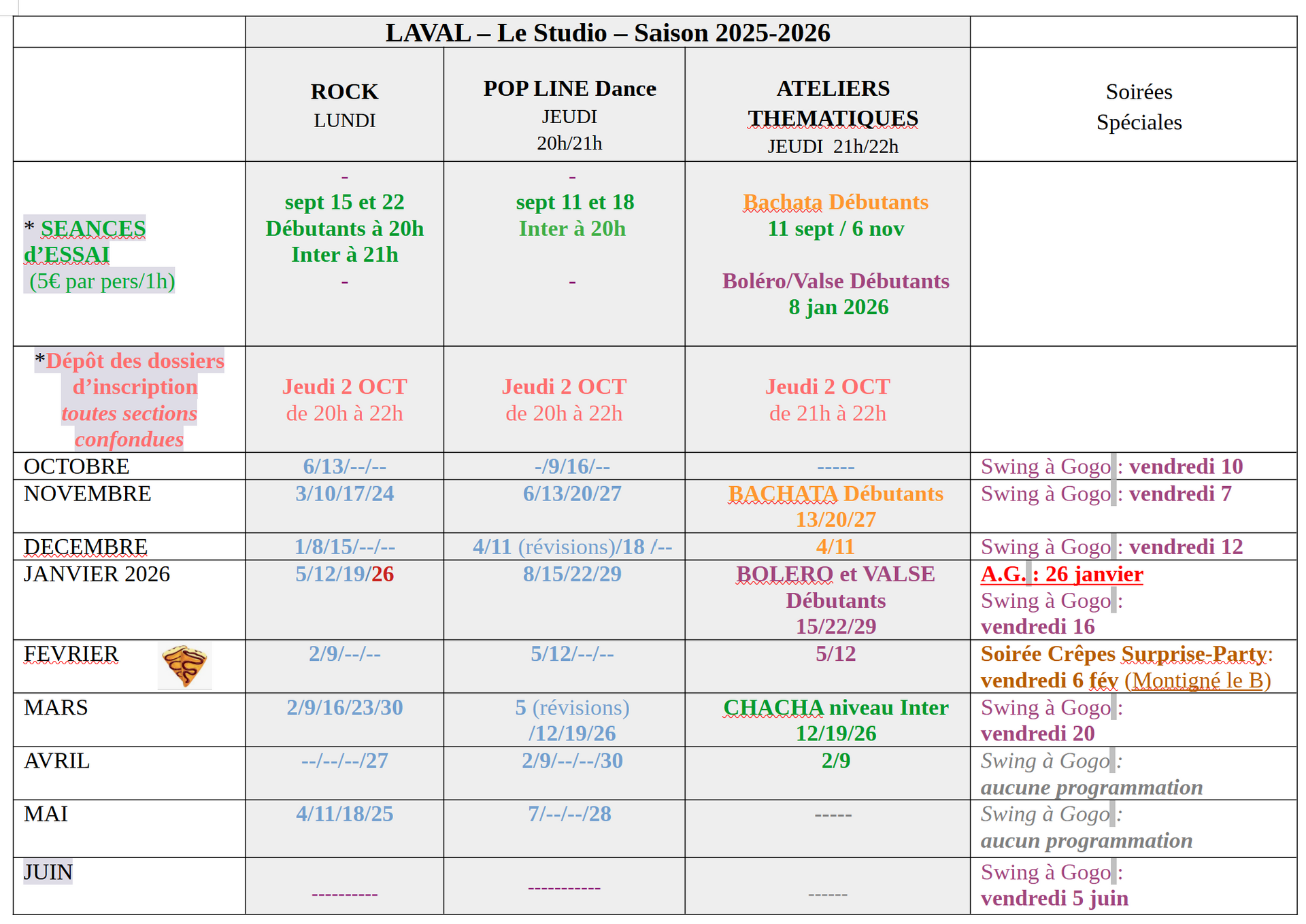 Il n'est pas possible d'envisager des séances d'essai en dehors des dates proposées, a fortiori une fois la saison commencée.